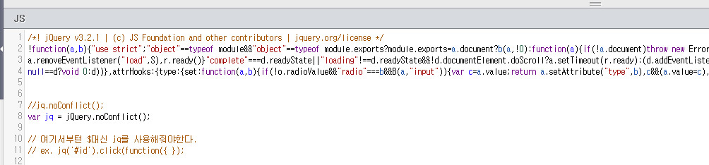 3. 해당 디렉토리로 이동하여 (/layout/basic/js/) custom.js 해당 파일을 열어 원하는 제이쿼리 버전을 복사하여 붙여넣기합니다. 그리고 하단의 코드를 작성해줍니다. jq는 다른 문자로 변경하여도 무방합니다.
