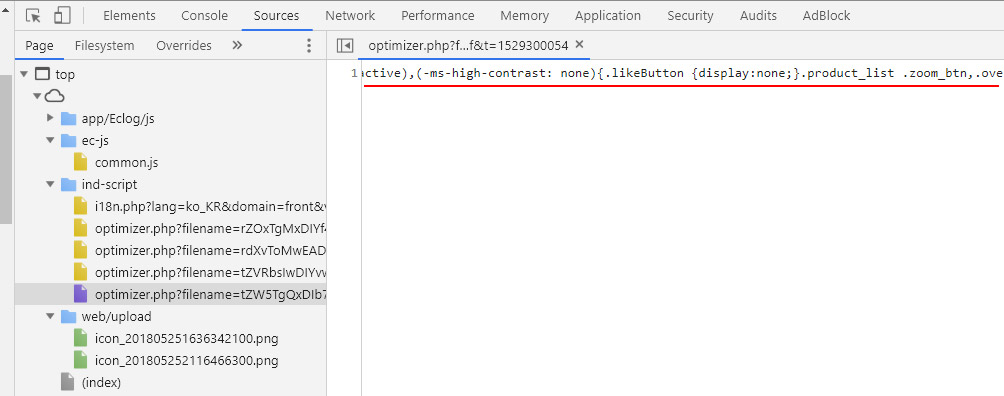 첫 번째 해당 방식의 경우 삽입하는 내용들이 하나의 파일로 결합됩니다. 예를들어 cafe24에서 기본적으로 로드되는 CSS중에 ec-base-help.css, ec-base-product.css, ec-base-paginate.css등 여러개의 CSS파일이 있는데 해당방식으로 <!--@css(/layout/basic/css/custom.css)--> 도 로드한다면 최종적으로 웹에 적용될 때는 아래와 같이 한줄로 압축되어 합쳐집니다. 아래의 그림을 참조하세요. 해당방식으로 로드를 하면 2개의 제이쿼리가 충돌이 일어날 수 있습니다.