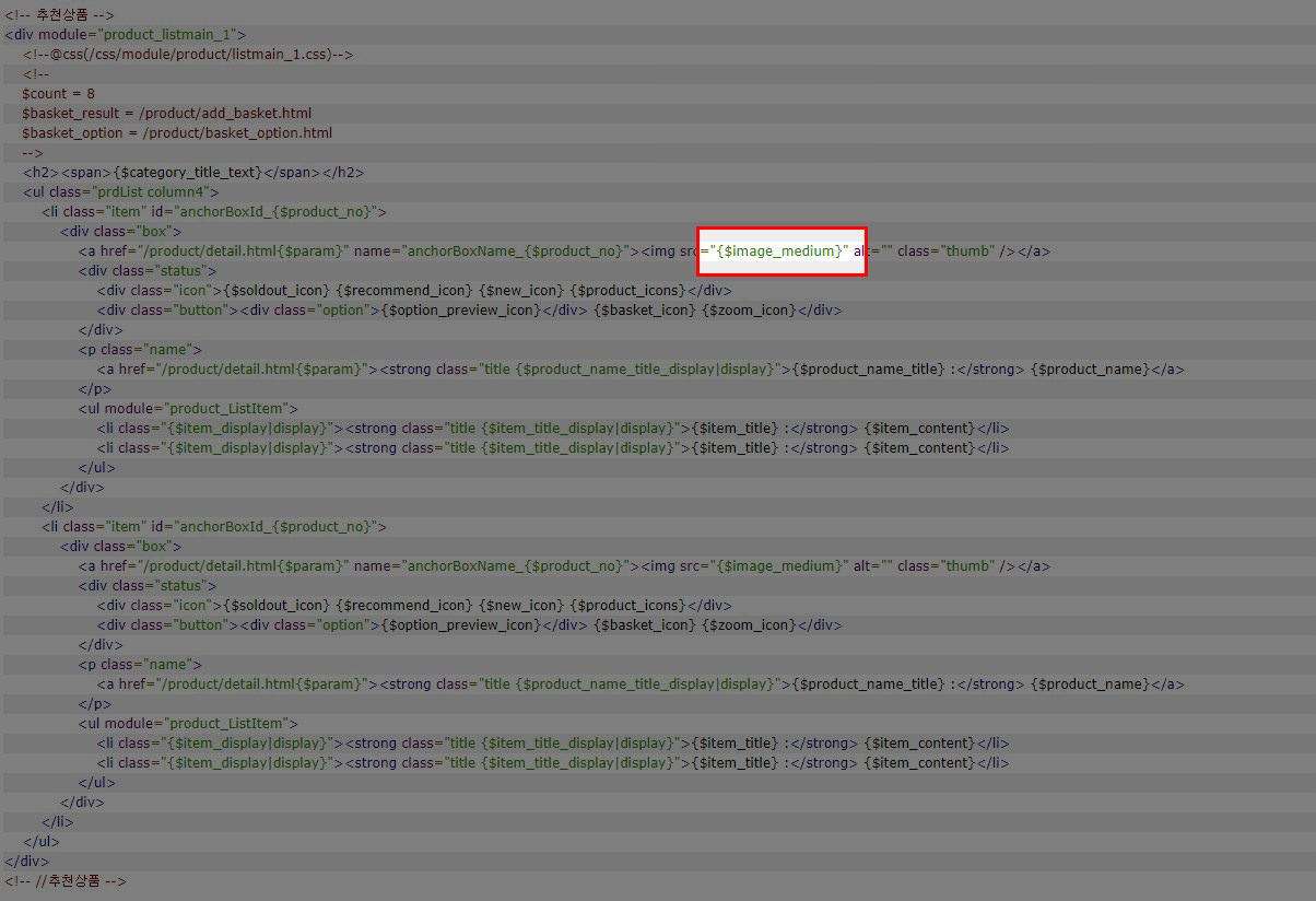 상품이 가지고 있는 이미지가 여러가지 사이즈로 나누어 지고 실제로 코딩에 사용할 때는 가능하면 사이즈가 비슷한 것으로 출력하는 것이 좋은데 이유는 웹페이지가 뜨는 속도가 좀 더 빨라지기 때문입니다. 카페24에서 리스트를 나타내는 모듈 대부분이 중간 사이즈인 $image_medium인데 상황에 따라 더 큰 이미지를 쓰거나 작은 이미지를 써야할 것입니다. 아래에 카페24에서 제공하는 코드입니다. 해당 메뉴얼은 이 페이지에서 상세하게 확인가능합니다.